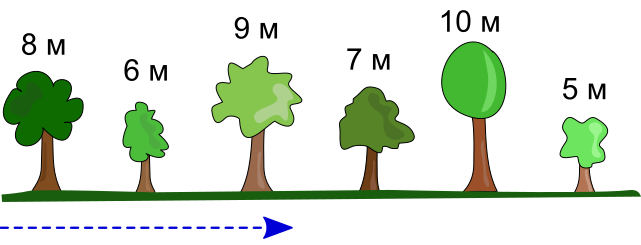 Например, если они решат срубить второе дерево слева (высотой 6 метров), то следующим они могут срубить только последнее дерево (высотой 5 метров), и в сумме получат 11 метров древесины.