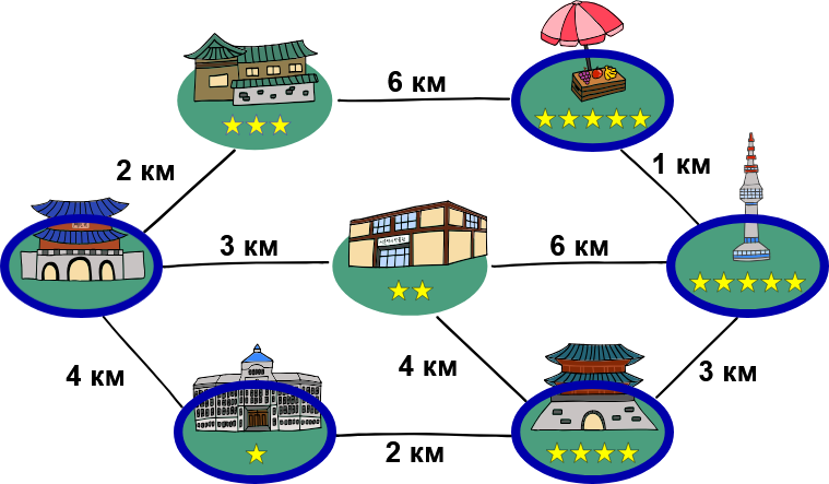 В Сеуле между основными достопримечательностями можно перемещаться на специальных туристических автобусах. На нижеприведённом рисунке показаны основные достопримечательности и расстояния между ними, а их популярность отмечена звёздочками.