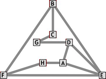 У Наташи есть схема, где все восемь островов отмечены буквами. На схеме были линии, обозначающие прямые соединения между островами с помощью волшебных домов. К сожалению, линии были удалены со схемы.