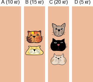 Бобрам необходимо отвезти пять больных кошек к ветеринару. Для этого они могут воспользоваться четырьмя переносками. Каждая переноска имеет определённую грузоподъёмность.