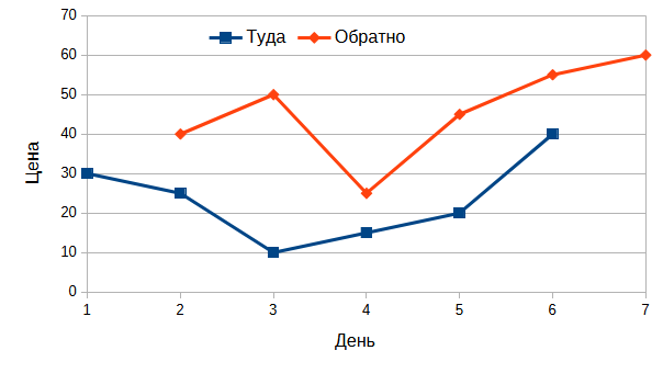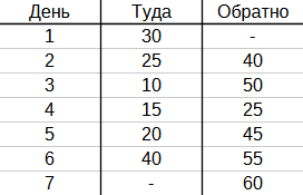 Бобр планирует отпуск и хочет воспользоваться специальными предложениями авиакомпании. Компания предлагает авиабилеты туда и обратно по разным ценам на каждый день.