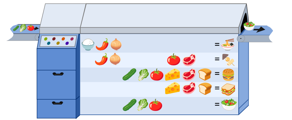 Roa valmistamisel kuluvad kõik selle lähteained ära ja nende asemel tuleb masina teisest otsast välja neist valmistatud roog. Masin ei saa ühe roa valmistamise ajal lähteaineid vahele jätta.