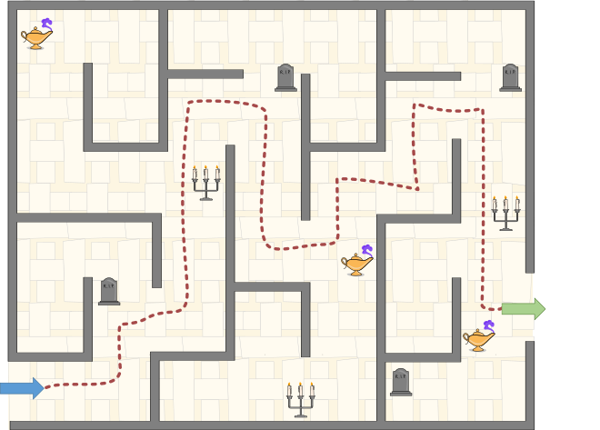 Передвигаясь по лабиринту, в местах разветвления коридоров он видел подсказки: подсвечники, масляные лампы и надгробия. Каждая подсказка указывала на определённое направление движения: налево, направо или прямо.
