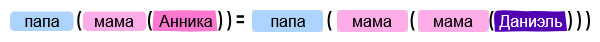 папа(X) обозначает "отец бобра X";мама(X) обозначает "мать бобра X".Например, отцом Анники является Бернд, а матерью Бернда — Кристина. С помощью формул это можно выразить следующим образом: