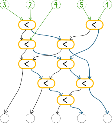 Iga lüli võrdleb kaht sissetulevat arvu ning suunab väiksema arvu edasi vasakpoolse ja suurema parempoolse noole suunas. Siin on üks näide: