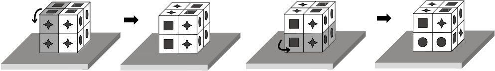Lais saab keerata neljast väiksemast kuubikesest koosnevaid gruppe kas vertikaalselt (alla või üles) või horisontaalselt (paremale või vasakule), nagu näidatud alloleval joonisel.