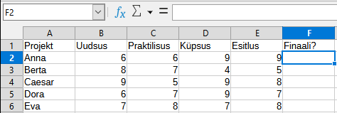 IF(tingimus;väärtus1;väärtus2) kui tingimus kehtib, on tulemus väärtus1; kui tingimus ei kehti, on tulemus väärtus2;OR(tingimus1;tingimus2) kehtib, kui kehtib kas tingimus1 või tingimus2 või mõlemad;AND(tingimus1;tingimus2) kehtib, kui tingimus1 ja tingimus2 mõlemad kehtivad;SUM(lahter1;lahter2) liidab kokku kõik arvud ristkülikus, mille vasak ülemine nurk on lahter1 ja parem alumine nurk lahter2 (lahter1 ja lahter2 kaasa arvatud).Millised ekraanipildil näha olevast viiest võistkonnast kutsutakse finaali?