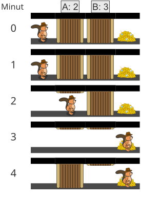 Igas käigus on hulk plokke. Alguses on kõik plokid all. Kui keegi käigu algusse ilmub, hakkavad plokid perioodiliselt liikuma. Plokk perioodiga 2 liigub 2 minuti pärast üles, järgmise 2 minuti pärast alla, järgmise 2 minuti pärast jälle üles jne.