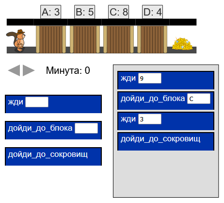(Перетащи команды в серое поле и заполни имеющиеся в командах пробелы правильными значениями. С помощью расположенных под туннелем стрелками ты можешь симулировать движение блоков по минутам.)
