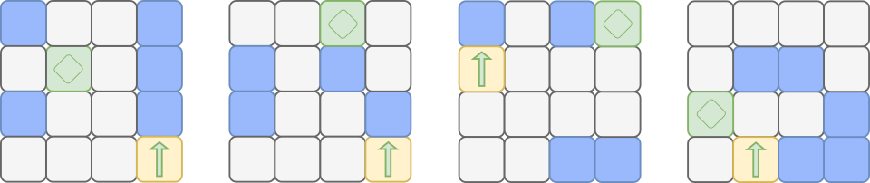 , pöörab ta vasakule (L) või paremale (R) vastavalt järgmisele käsule saadud käsujadas. Kui robot on sinisel ruudul ja käsk suunab ta vastu seina, pöörab robot seina ees ümber ja liigub vastassuunas: