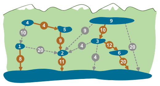 Insenerid on kaardistanud võimalikud toruühendused tiikide ja veehoidla vahel. Igal toruühendusel on kindel läbilaskevõime (veehulk, mida selle kaudu saab ära juhtida) ja hind, mis on toruühenduse läbilaskevõime korda miljon eurot.