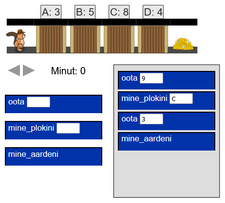 (Lohista käsud halli alasse ja täida neis lüngad õigete väärtustega. Käigu all olevate nooltega saad simuleerida plokkide liikumist minutite kaupa.)